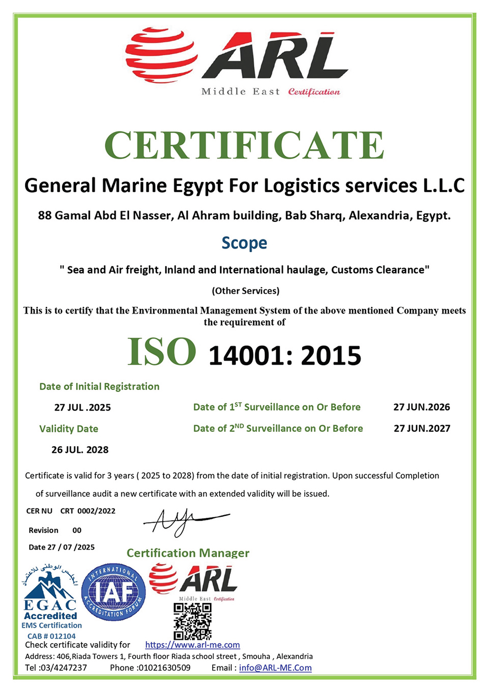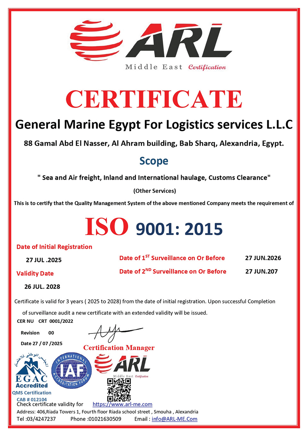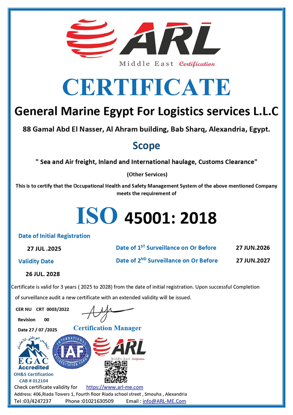 - At General Marine Egypt, we couple deep industry knowledge with an adaptive approach, always focusing on the customer's needs. We strive to deliver excellent sea or air freight, door to door, customs clearance, inland haulage and import and export complete logistics services to the highest international standards